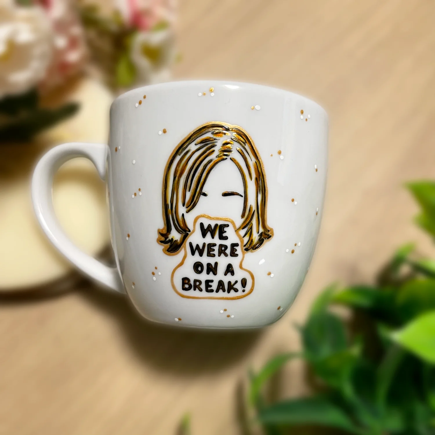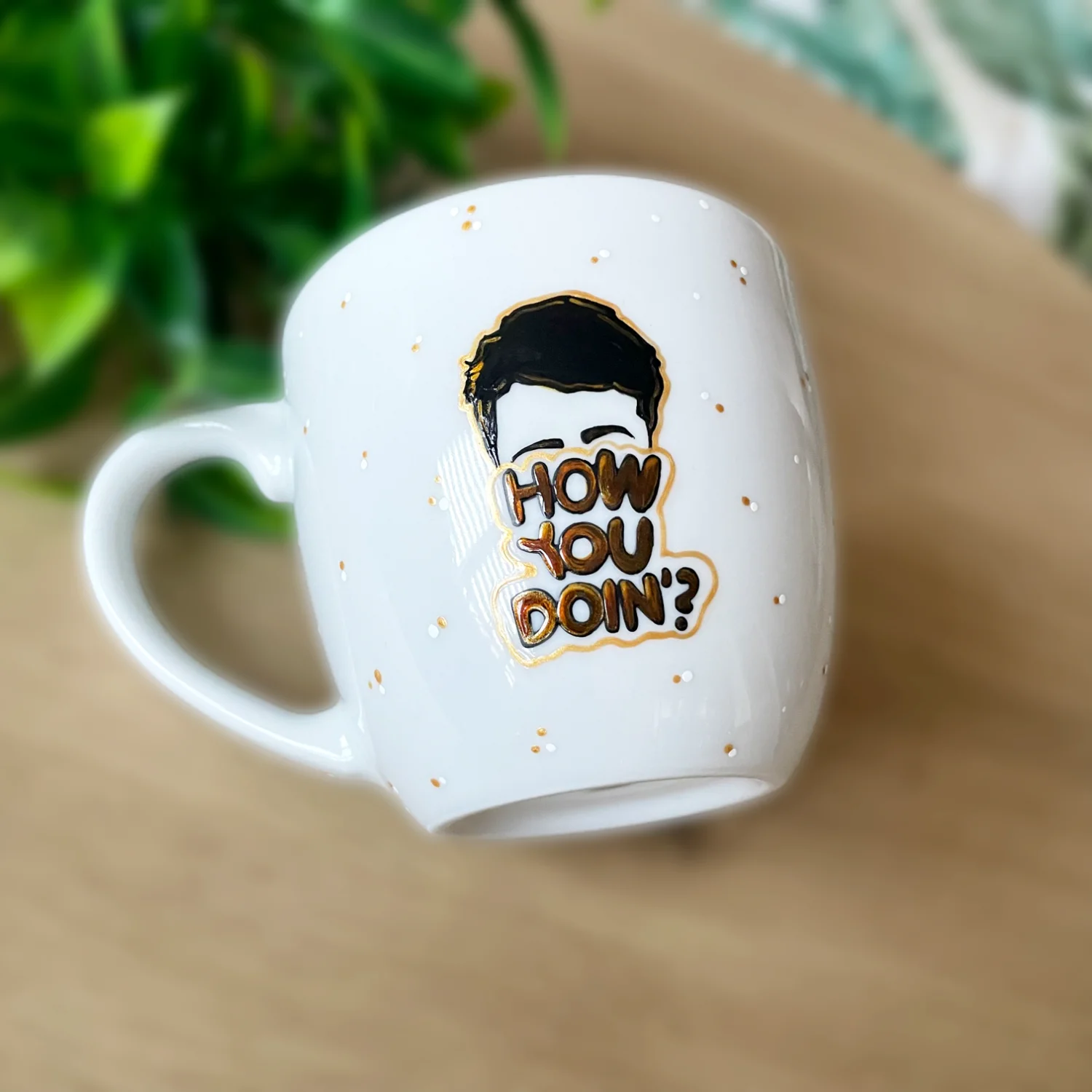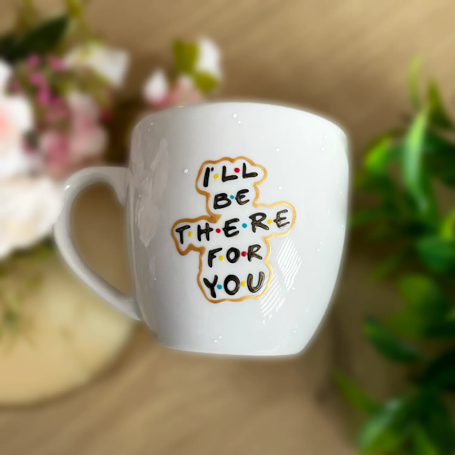 Ręcznie malowany kubek porcelanowy z polskiej porcelany Lubiana, z motywem nawiązującym do serialu Friends. Dookoła subtelnie nakrapiany.