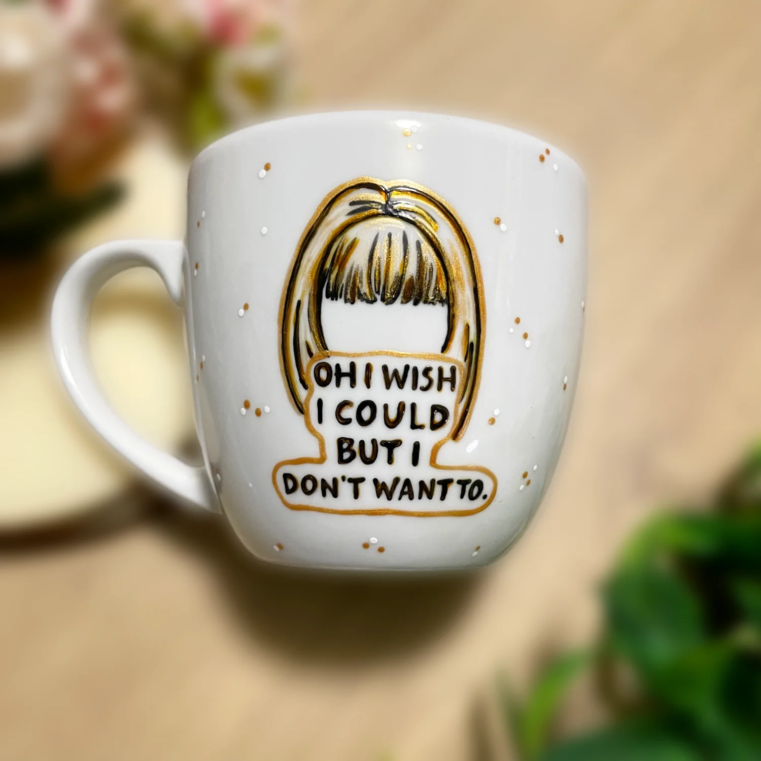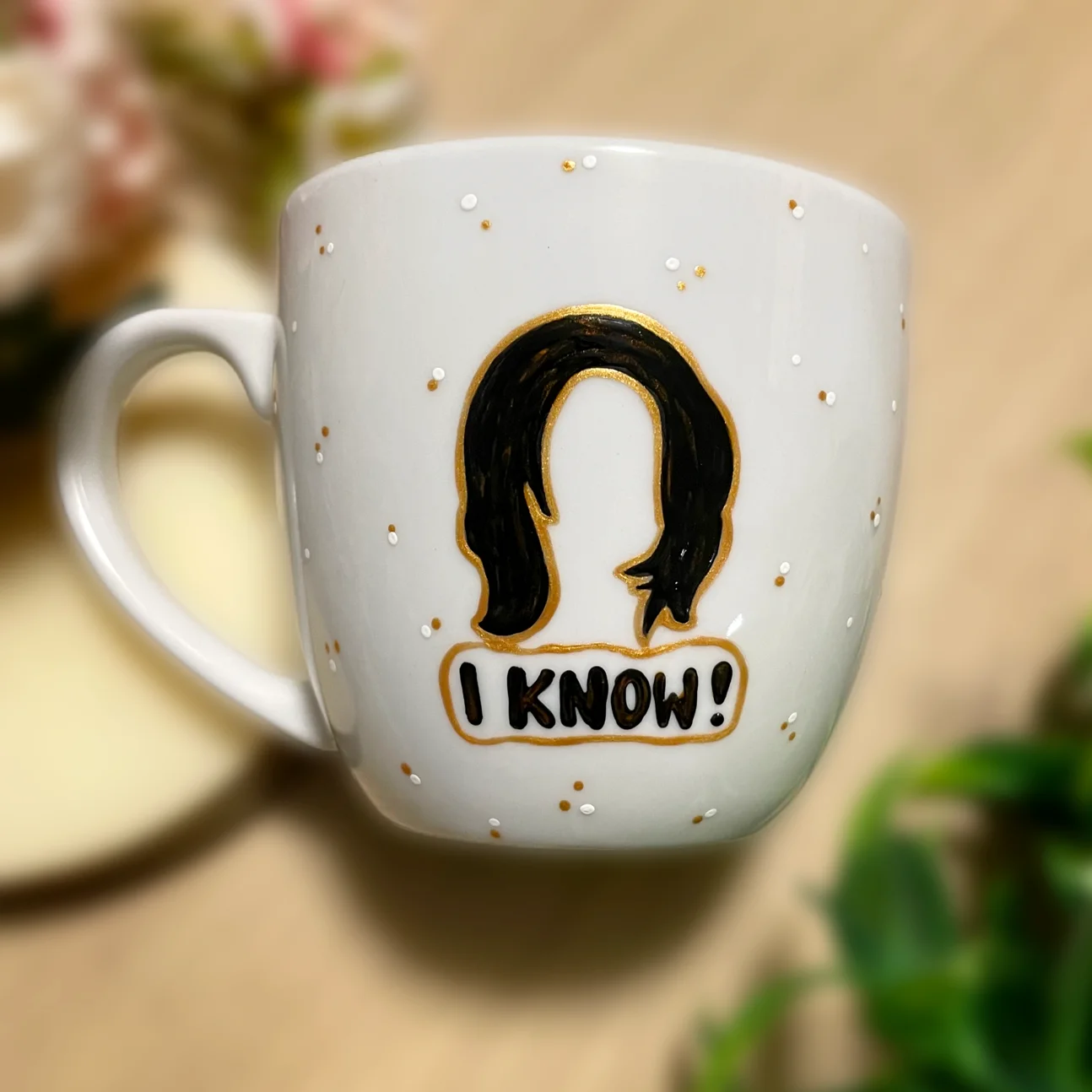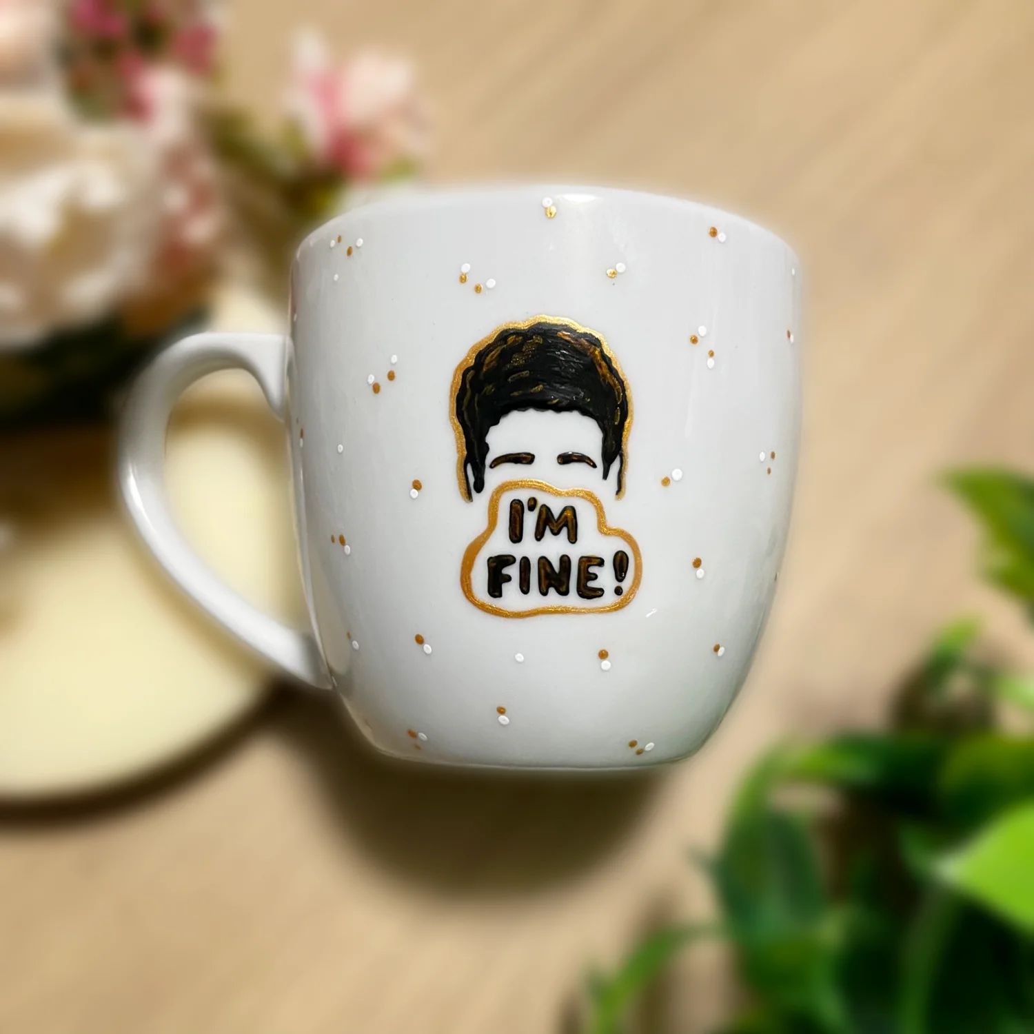 Ręcznie malowany kubek porcelanowy z polskiej porcelany Lubiana, z motywem nawiązującym do serialu Friends. Dookoła subtelnie nakrapiany.