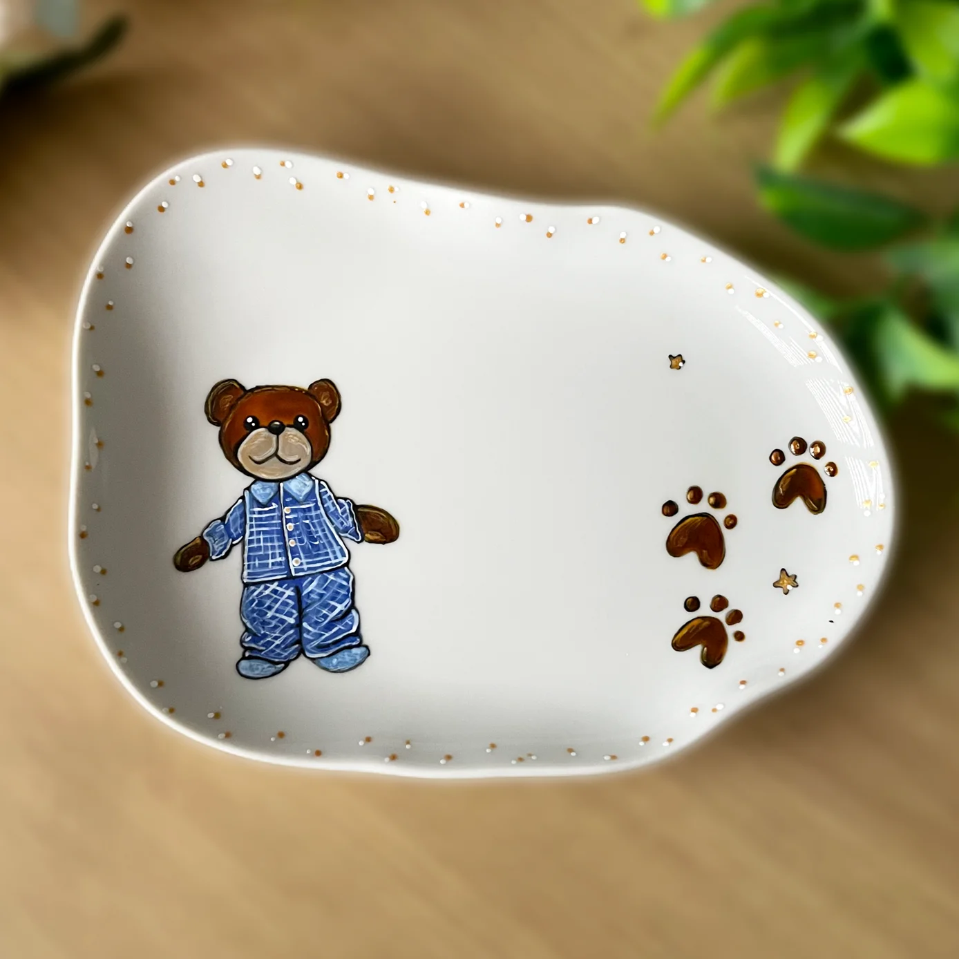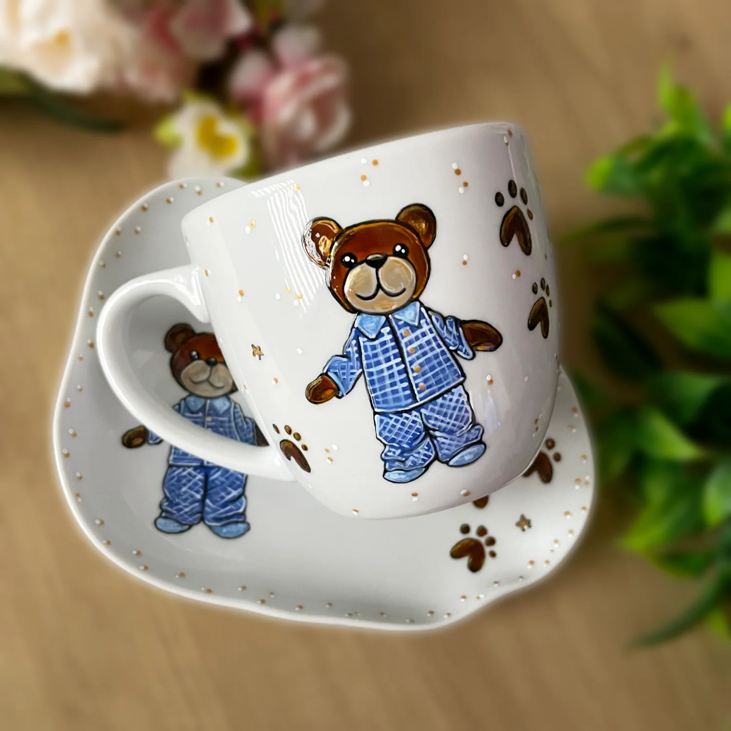 Ręcznie malowany kubek porcelanowy z polskiej porcelany Lubiana, z motywem misia. Dookoła subtelnie nakrapiany.