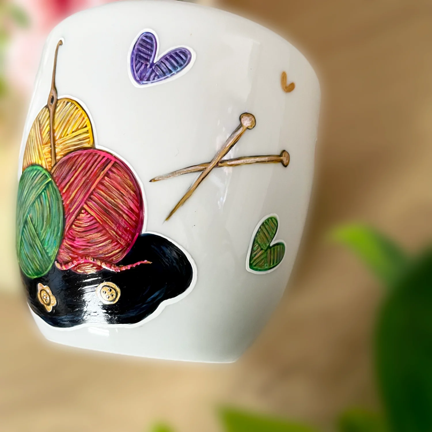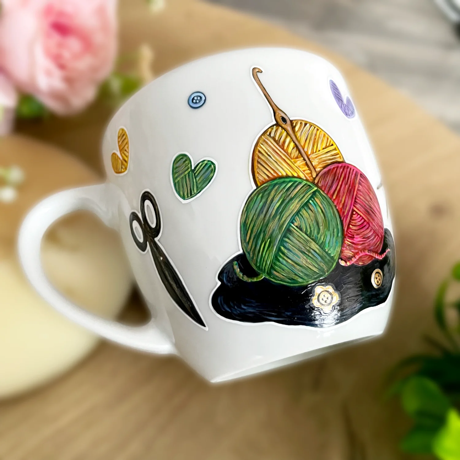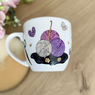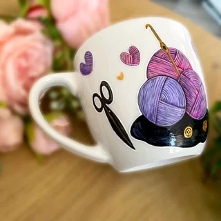 Porcelanowy kubek ręcznie malowany o pojemności 400ml ( mam też taki sam model kubka-300ml) z motywem szydełka, włóczek, oraz plecionych serduszek.