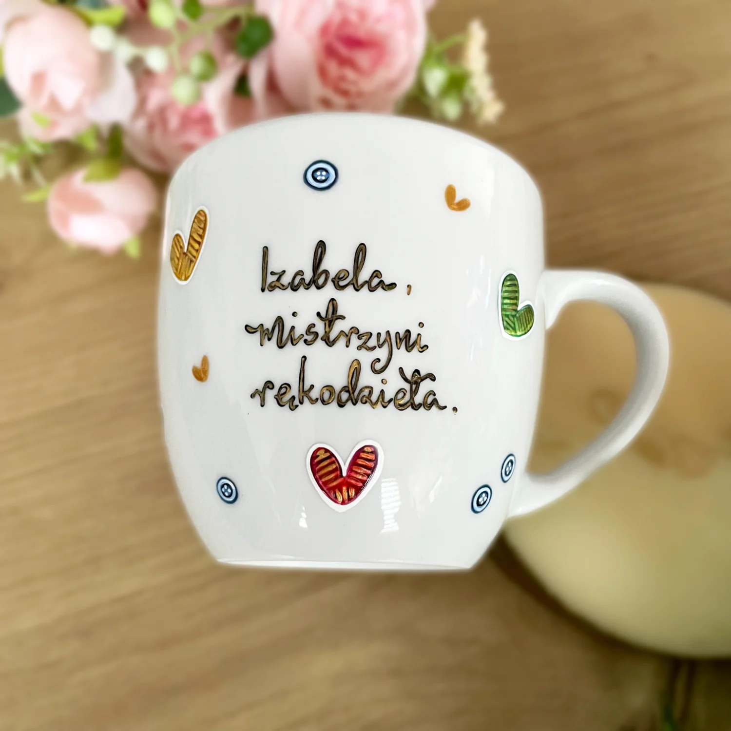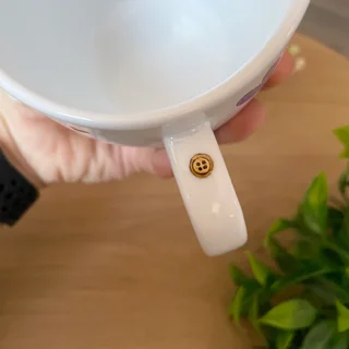 Na uchu kubka namalowany detal w postaci guziczka.
