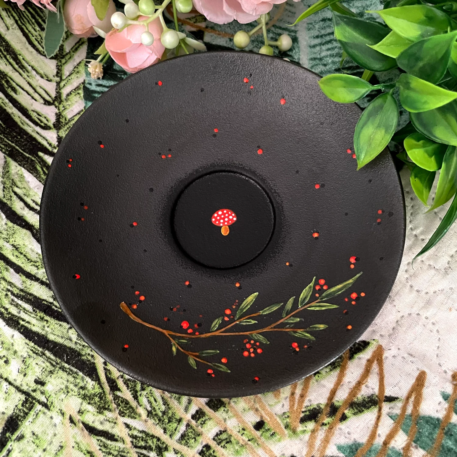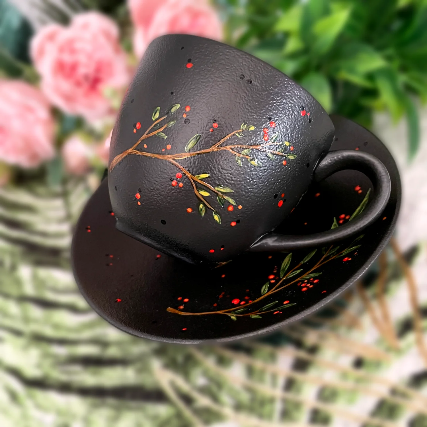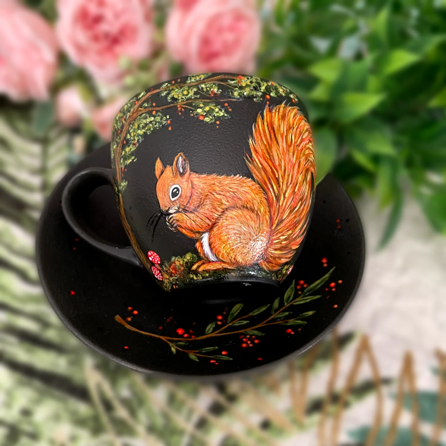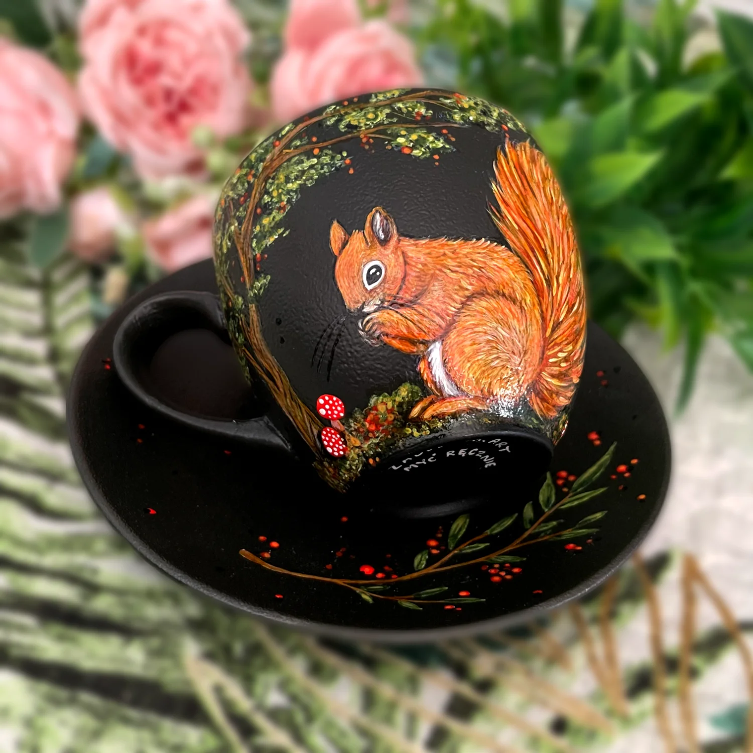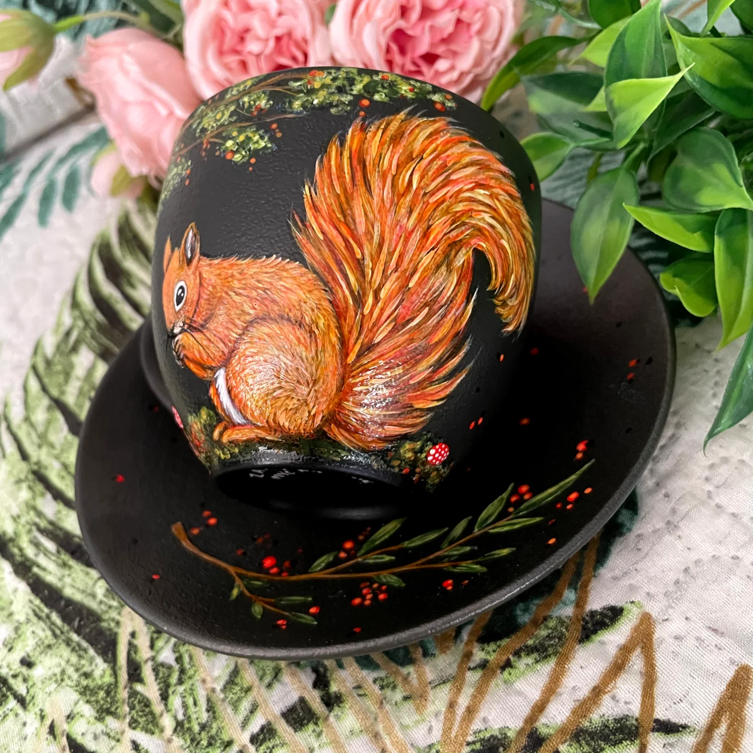 Ręcznie malowana porcelanowa filiżanka ze spodkiem firmy Bogucice,  w kolorze matowej czerni z ilustracją wiewiórki, gałązek i muchomorków.
